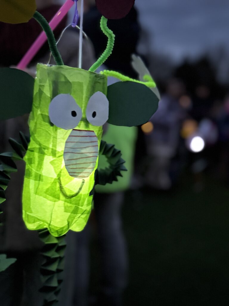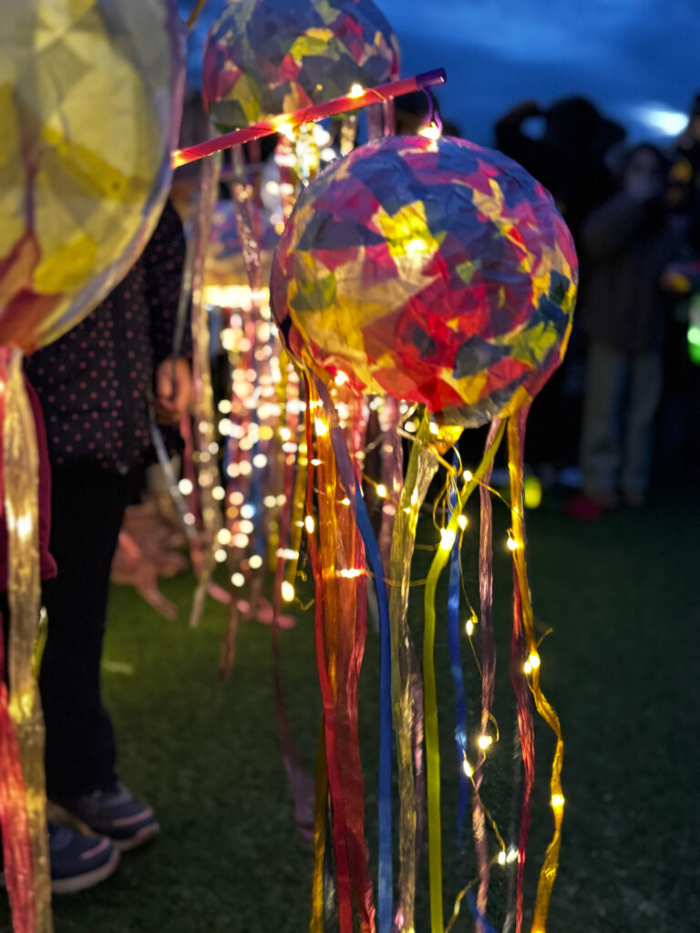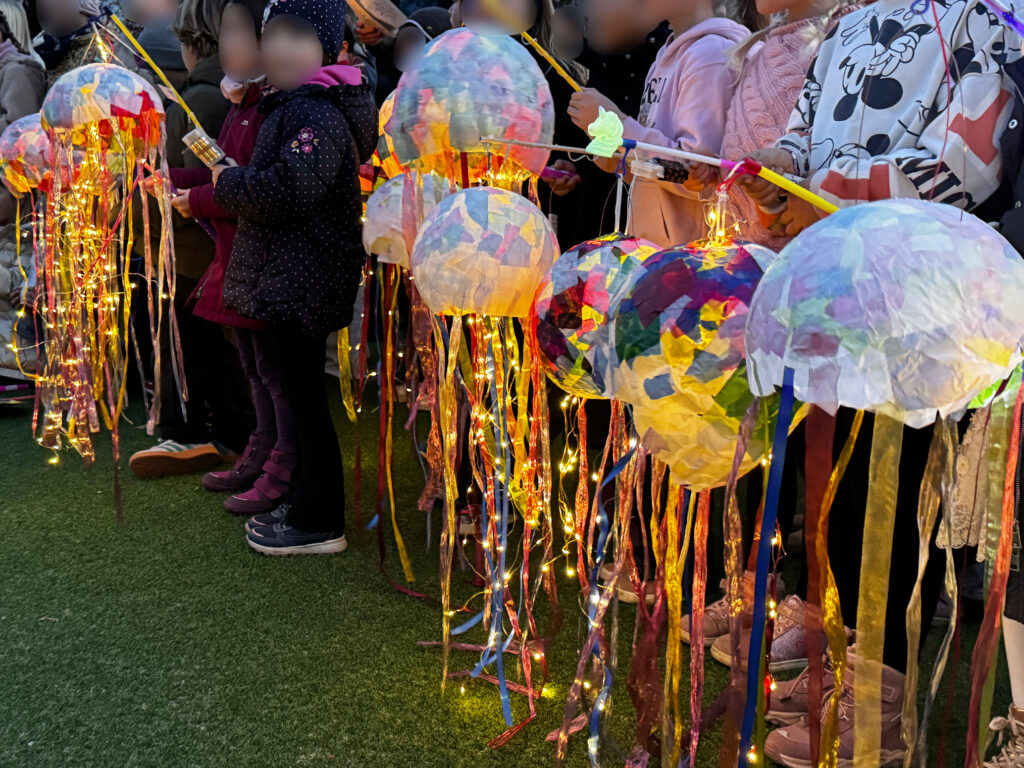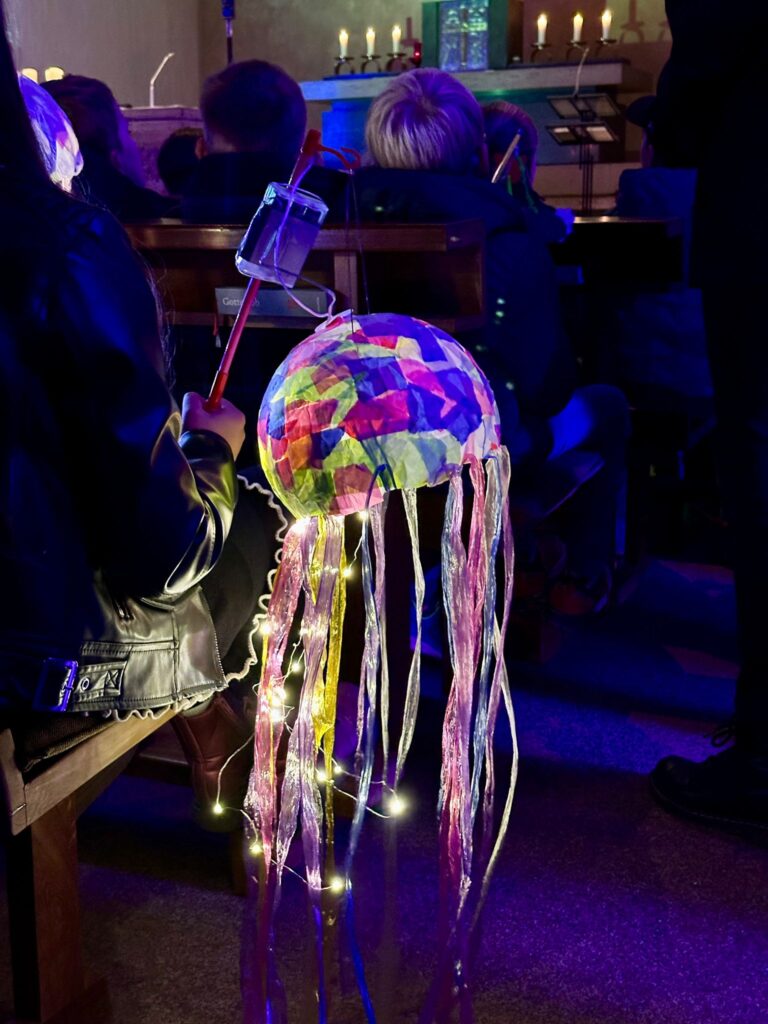 Im 2. Jahrgang bastelten die Erdmännchen, Otter und Dachse mit viel Fantasie ihre Laternen – das kleine WIR, die Erdmännchen-Laternen und bunten Quallen leuchteten wunderschön und farbenfroh.