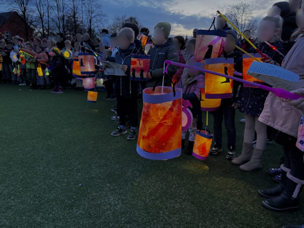 Gestern haben wir gemeinsam unser Martinsfest gefeiert. Auf dem großen Sportplatz haben sich alle Klassen im Kreis versammelt. Ein echtes Blasorchester von der Musikschule hat gespielt, und wir haben viele schöne Martinslieder gesungen. Überall leuchteten unsere bunten Laternen – jede einzelne war ein kleines Kunstwerk und hat gezeigt, wie viel Mühe und Kreativität in ihnen steckt.