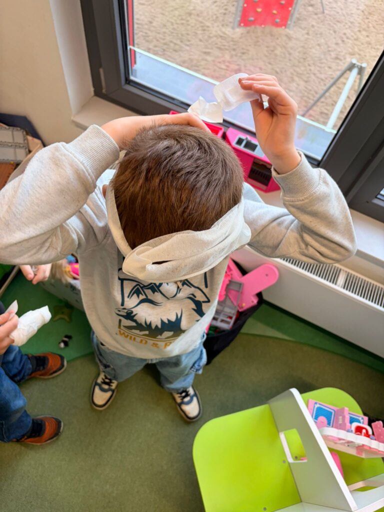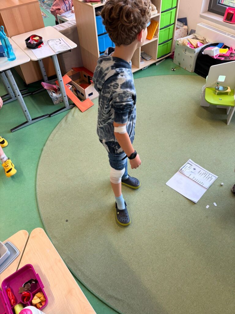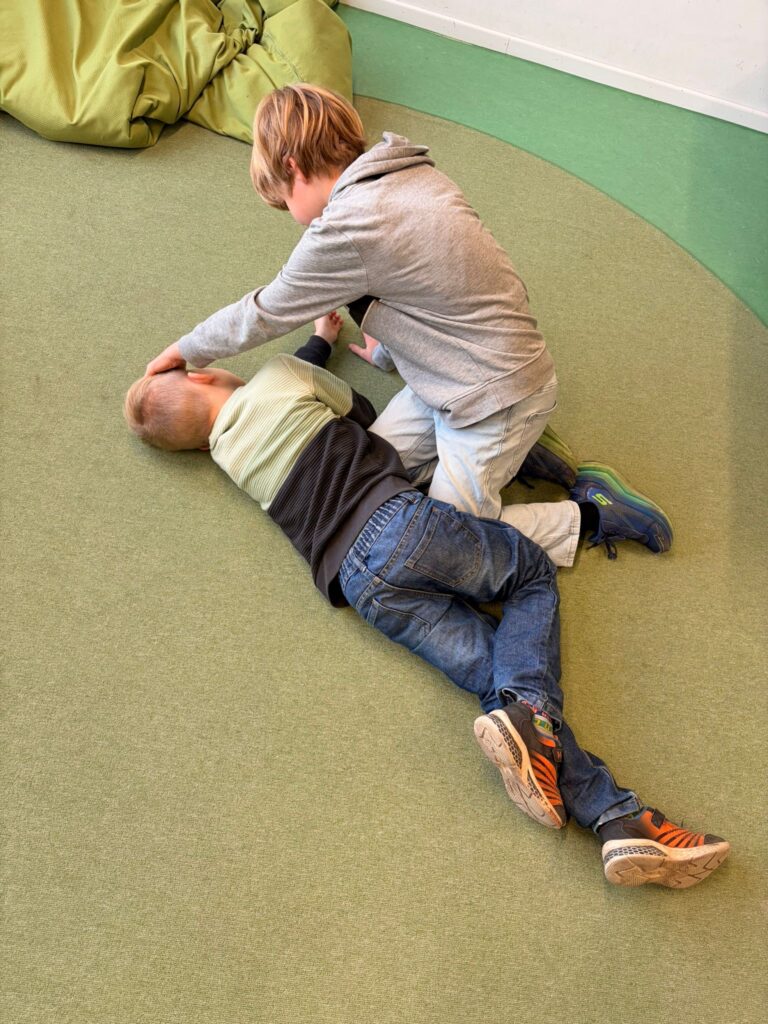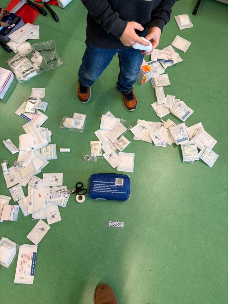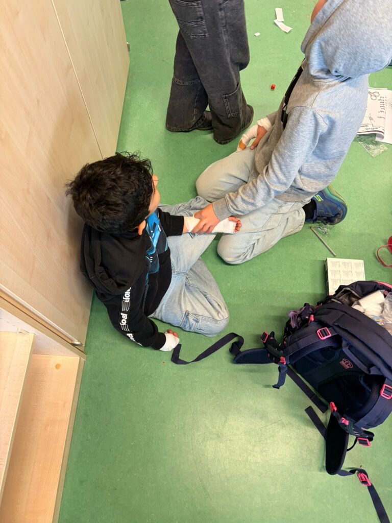 Parallel dazu nehmen die Streithelfer an einer Ersthelferausbildung teil. Hier lernen sie grundlegende Maßnahmen wie das Pflaster kleben, den richtigen Umgang mit kleinen Verletzungen und die stabile Seitenlage. So sind sie auch in kleinen Notfällen gut vorbereitet.
